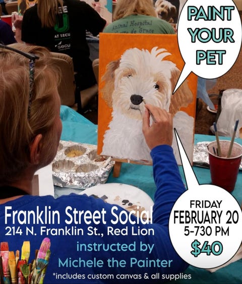 Join us for a fun Friday night out at Franklin Street Social! Enjoy a bite to eat and a beverage as you Paint Your Pet! Friday, February 20, 5-730pm Admission cost is $40 per person and will include absolutely everything you need to create a 11x14 custom acrylic masterpiece on canvas of your pet (or favorite animal)